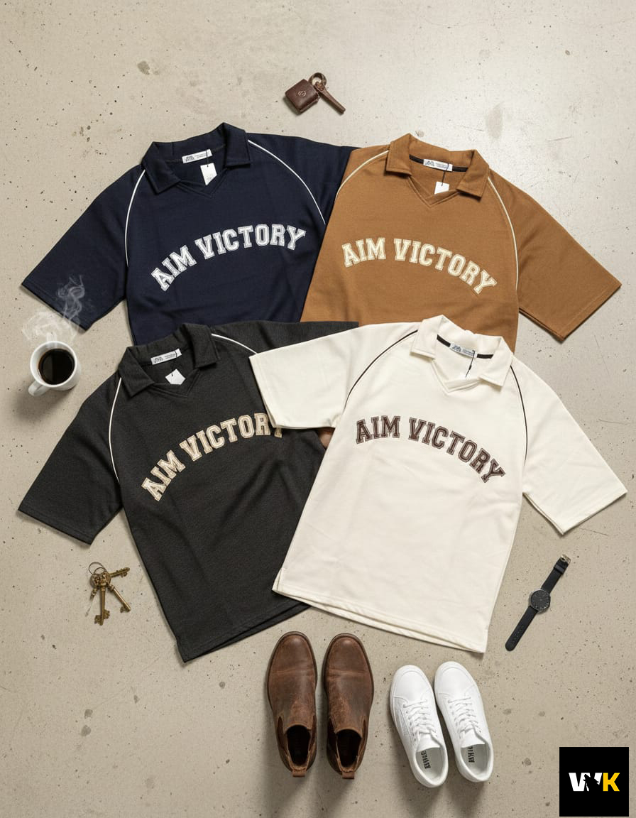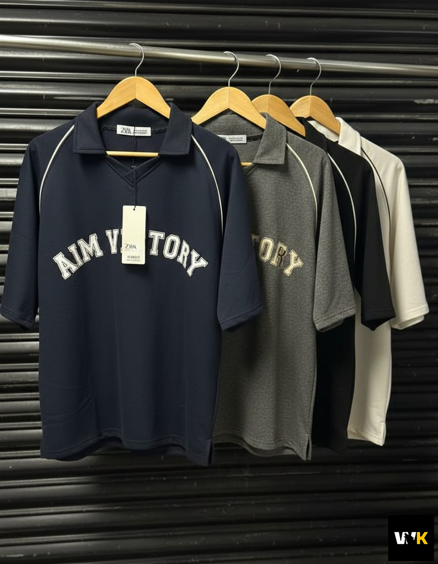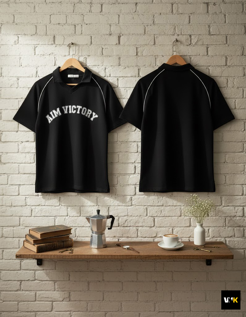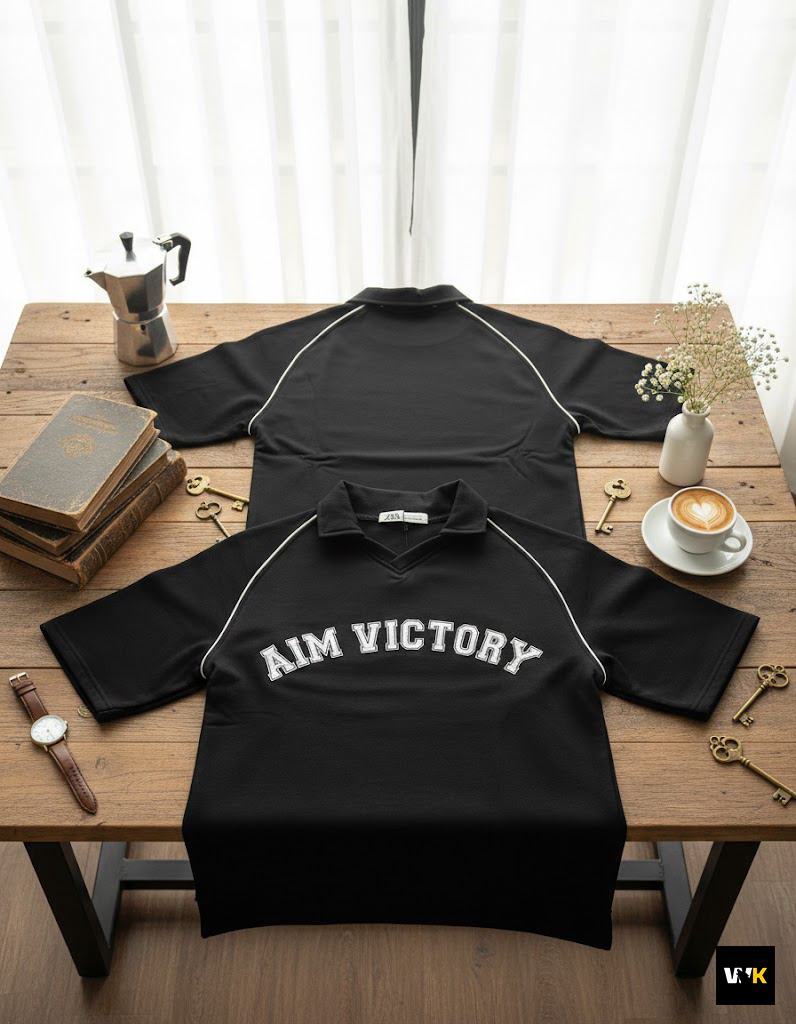 The ultimate essential. Our “Aim Victory” polo in classic black is designed for those who want a high-contrast, sharp look. The crisp white piping highlights the unique raglan sleeve construction, making the oversized fit pop. This is the go-to piece for a sleek, effortless streetwear fit.